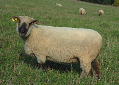 Head and Neck: Head, short, broad between the ears and eyes, bold and masculine in rams, without horns; straight or slightly dished face, broad muzzle, masculine on rams, feminine on ewes; white dense wool well covering the whole poll and cheeks and jaw; eyes bright and alert; colour of face and ears dark brown, grey nose hairs permissible.